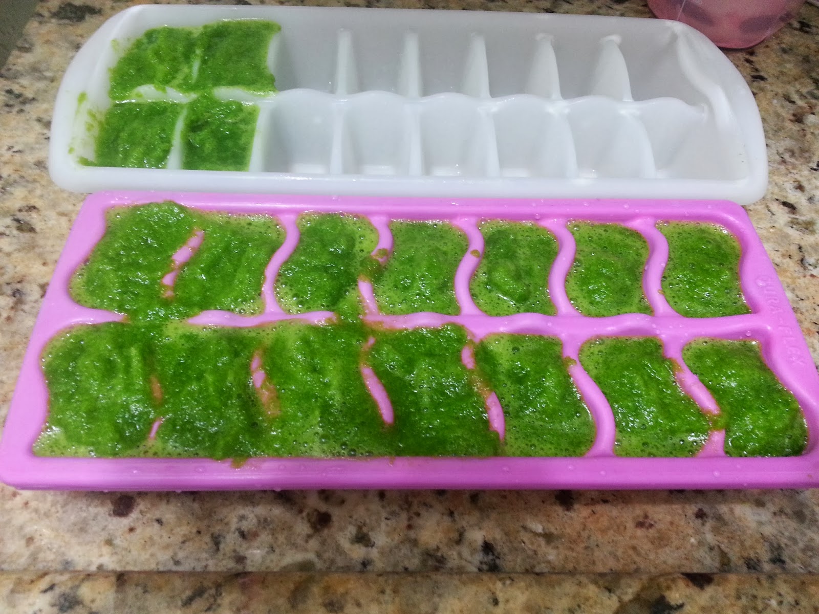 Eu fazia sempre o "gelinho" da couve para facilitar fazê-lo de manhã, e além disso fica muito refrescante, beeeem gelado. Para fazer o suco, use dois cubos de couve.